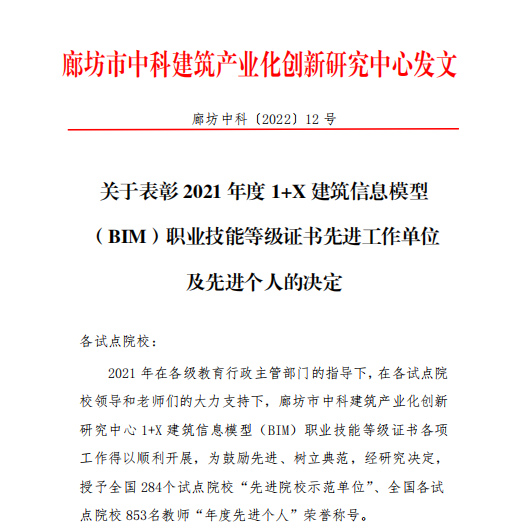 近日,由廊坊市中科建筑产业化创新研究中心主办的2021年度“1+X”建筑信息模型(BIM)职业技能等级证书考评工作刚刚结束。本次考评在全国范围内共评选出284个“先进院校示范单位”和853名“年度先进个人”教师,其中陕西省有三所试点院校荣获“先进院校示范单位”,公司便是其中之一。