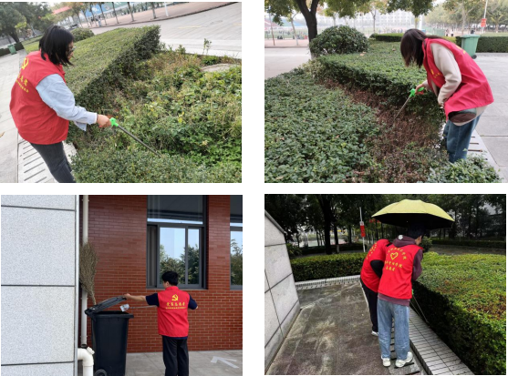 建设文明校园、营造优美校园环境是全院师生共同责任。每个午休时刻,“红马甲”的身影便出现在网格化管理责任区域。她们分工明确、协作有序、不畏风雨,对道路、花坛、下水口的纸屑、烟头等垃圾进行清理。在创建过程中,党员教师们率先带头,以身作则,充分诠释党员先锋的意义,为员工们树立良好榜样。广老员工积极参与,风雨无阻,共同维护校园环境,自觉做文明风尚的践行者和传播者。