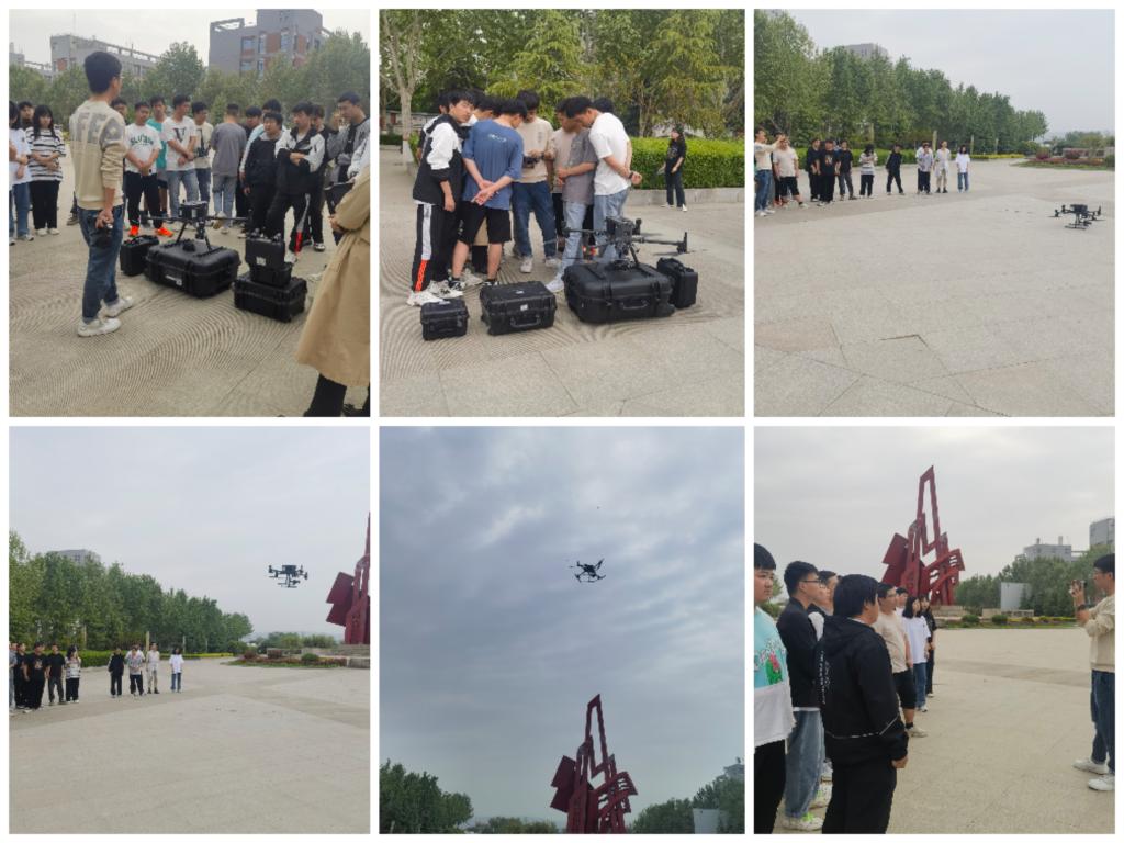讲座结束之后,企业专家在室外展示了大疆M300无人机,详细讲解了该型号无人机的构造、组装过程、航线规划、外业航拍等无人机测绘实施全过程。并结合校园地形特点设置航线,通过倾斜摄影测量技术外业航拍采集了校园三维建模影像数据。