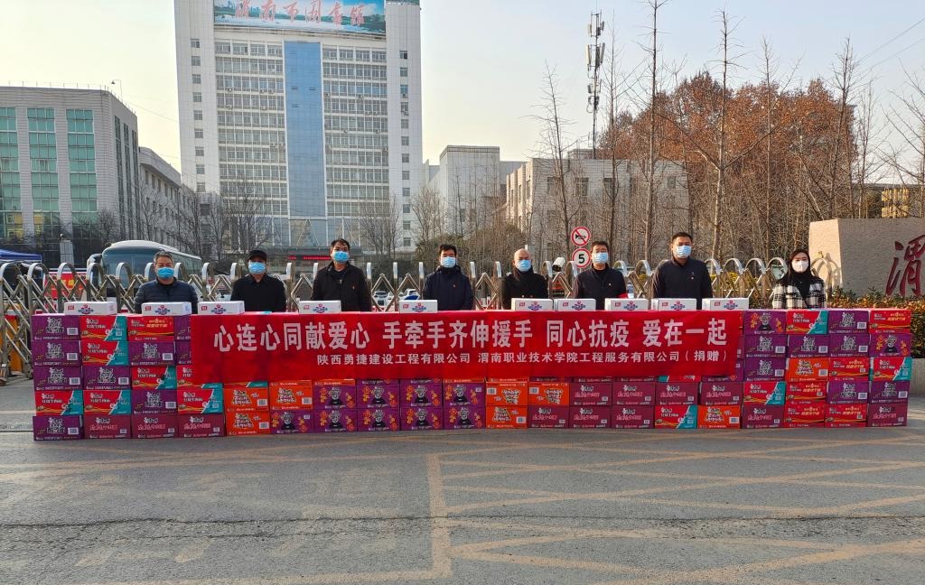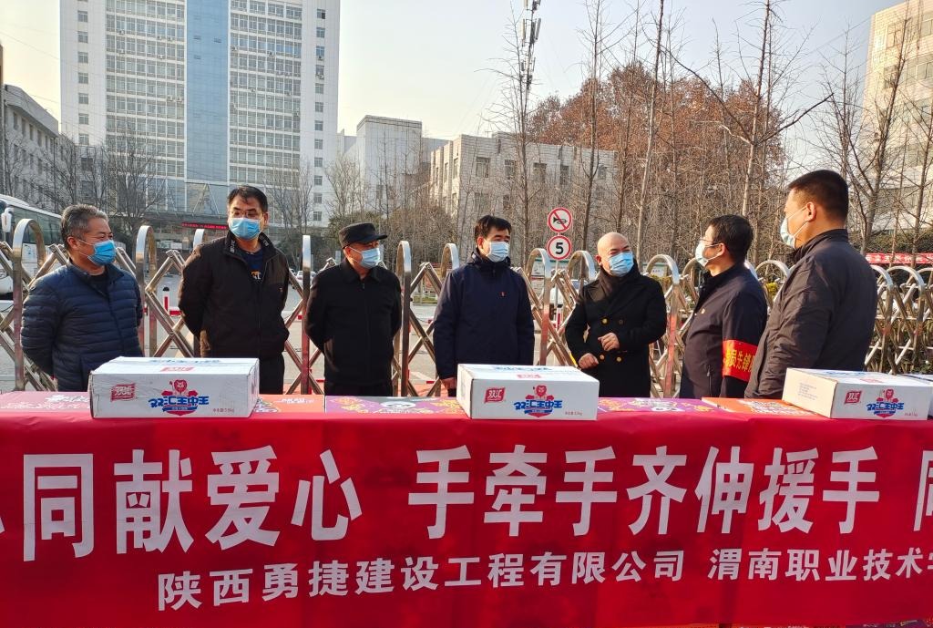 2022年1月2日下午,best365官方网站工程服务有限公司、陕西勇捷建设工程有限公司助力公司抗疫工作,慰问一线抗疫工作人员,并捐赠100箱方便面、10箱火腿肠等物资。王录军副书记、best365经理孙志强、朝阳校区防疫办副组长张勇、基建处处长党晓鹏、保卫处副处长王伟、陕西勇捷建设工程有限公司董事长陈勇等参加捐赠仪式。