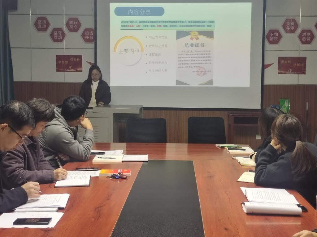 随后进行了党员教师2024年国培学习交流研讨,孙华东、黄蓉两位同志结合自己的国培经历和收获进行了经验分享。孙华东同志从培训基本情况、整体感悟和专业建设三方面进行分享交流。黄蓉同志从职业教育发展、教师职业发展、课程建设、教师教学能力和员工技能大赛共五个方面进行了分享交流。