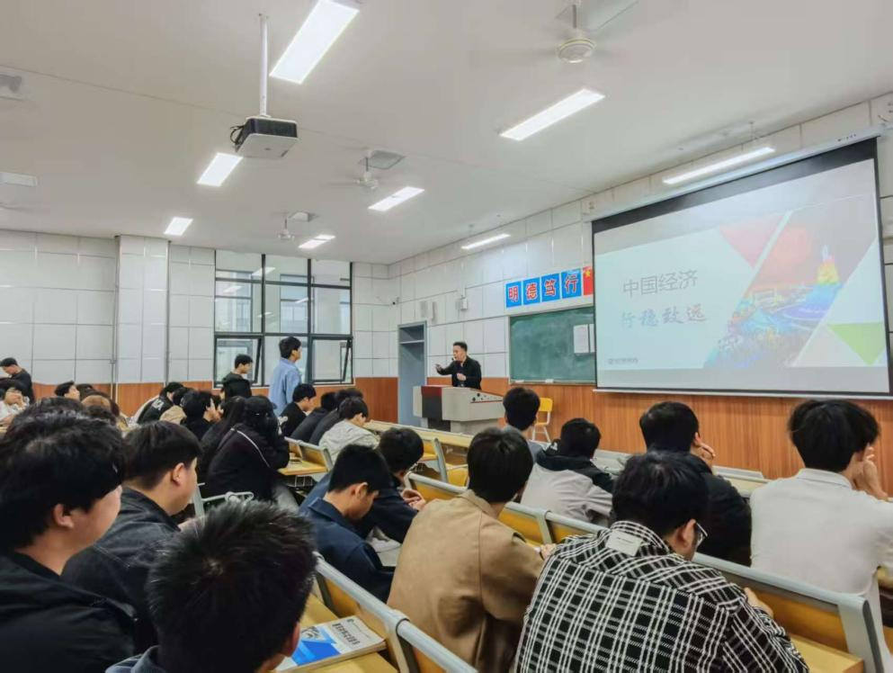 课堂上,张国栋从《时事报告》中的中国经济章节引入讲授内容。他采用“理论讲授 + 情景模拟 + 互动问答” 的授课形式,紧密围绕国内外经济形势新变化,引导大家深入思考和领悟习近平经济思想的科学内涵与实践要求,坚定走中国特色社会主义经济发展道路的信心与决心,鼓励青年学子要立足专业知识,培养全球视野,积极投身于国家经济建设与对外开放的伟大事业中。整个课堂气氛活跃,师生互动热烈,充分展现了员工们的学习热情和主讲人教学智慧。
